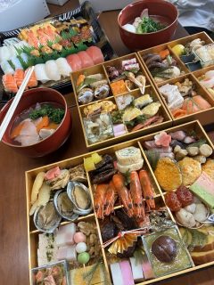 ガラスの森の岡崎さんが作ってくれるお雑煮と(ご実家レシピ→スルメでお出汁をとっていて凄くおいしいのです)とお寿司も買ってきて